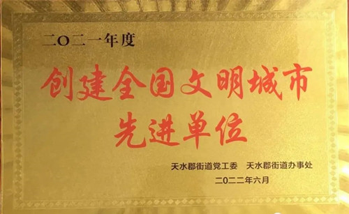 我公司獲得天水郡街道黨工委、天水郡街道辦事處頒發(fā)的2021年度“創(chuàng)建全國(guó)文明城市先進(jìn)單位”稱號(hào)。