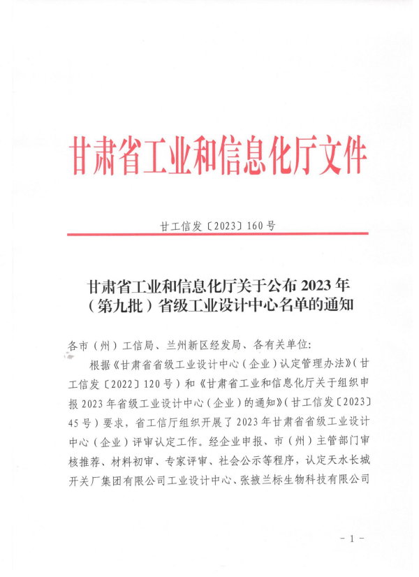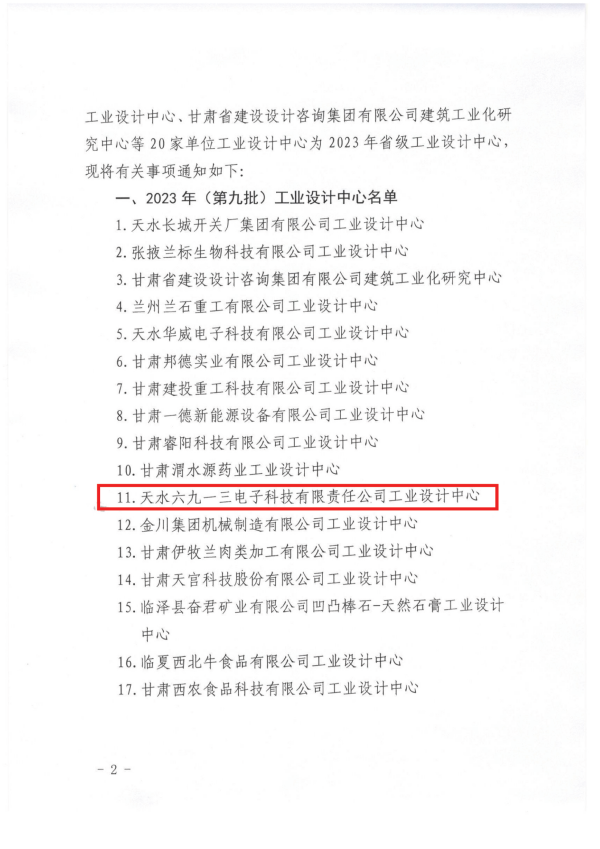 7410026月27日,甘肅省工業(yè)和信息化廳公布2023年(第九批)省級工業(yè)設(shè)計中心名單,經(jīng)省工信廳組織評審、公示,天水六九一三電子科技有限責(zé)任公司工業(yè)設(shè)計中心被認定為2023年省級工業(yè)設(shè)計中心。
